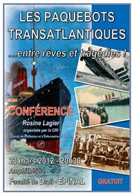 Cette conférence, qui s'accompagne d'une projection de nombreux documents d'époque, souvent rares, fait revivre la saga des transatlantiques et leurs destins, le boom d'une émigration de masse avec ses causes et ses conséquences.
