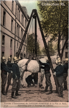 les pompiers s’entraînent à relever un cheval tombé sur les pavés glissants).